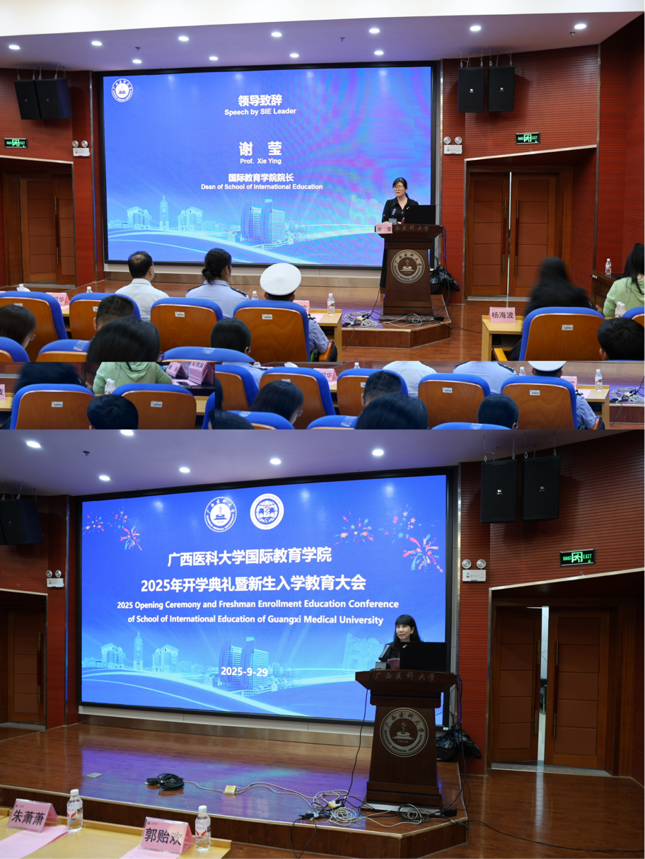 开学典礼伊始,师生代表分别发言:2025级赤道几内亚籍眼科学专业硕士研究生莫托作为新生代表表达了对大学生活的期待;2024级老挝籍内科学博士研究生苏丽万作为在校生代表分享了在华学习体会;对外汉语教师谢丽作为教师代表寄语新生。最后,谢莹院长致辞,对新生提出期望和要求,勉励新生珍惜时光、努力学习、遵纪守法。开学典礼最后,全体国际新生进行庄严的医学生誓词宣誓。