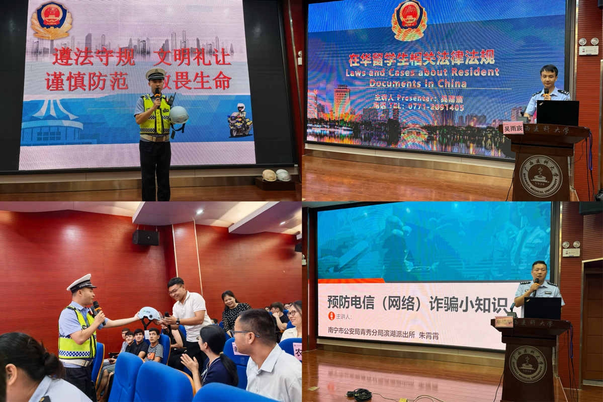 随后的入学教育大会中,南宁市公安局交警支队郭贻欢、出入境管理支队吴雨宸、青秀分局滨湖派出所牟昭华三位警官,分别就交通安全法规、出入境法规和预防电信诈骗进行了专题宣讲,内容实用,案例生动,提高了新生对在华法律制度的了解。学院赵斌、郭尔娜、王臻、樊俊聪四位老师先后对住宿管理、教学与学籍制度、学生管理规定及心理健康等内容进行讲解,帮助新生尽快适应在华学习生活。